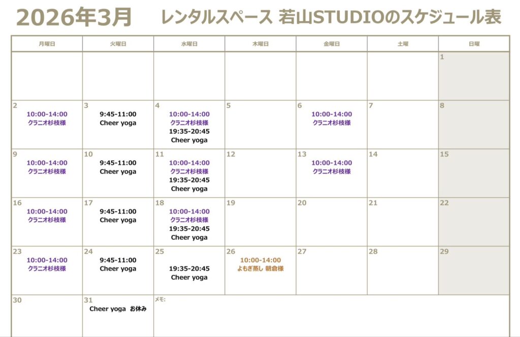 3月 レンタルスペース 若山STUDIOスケジュール表